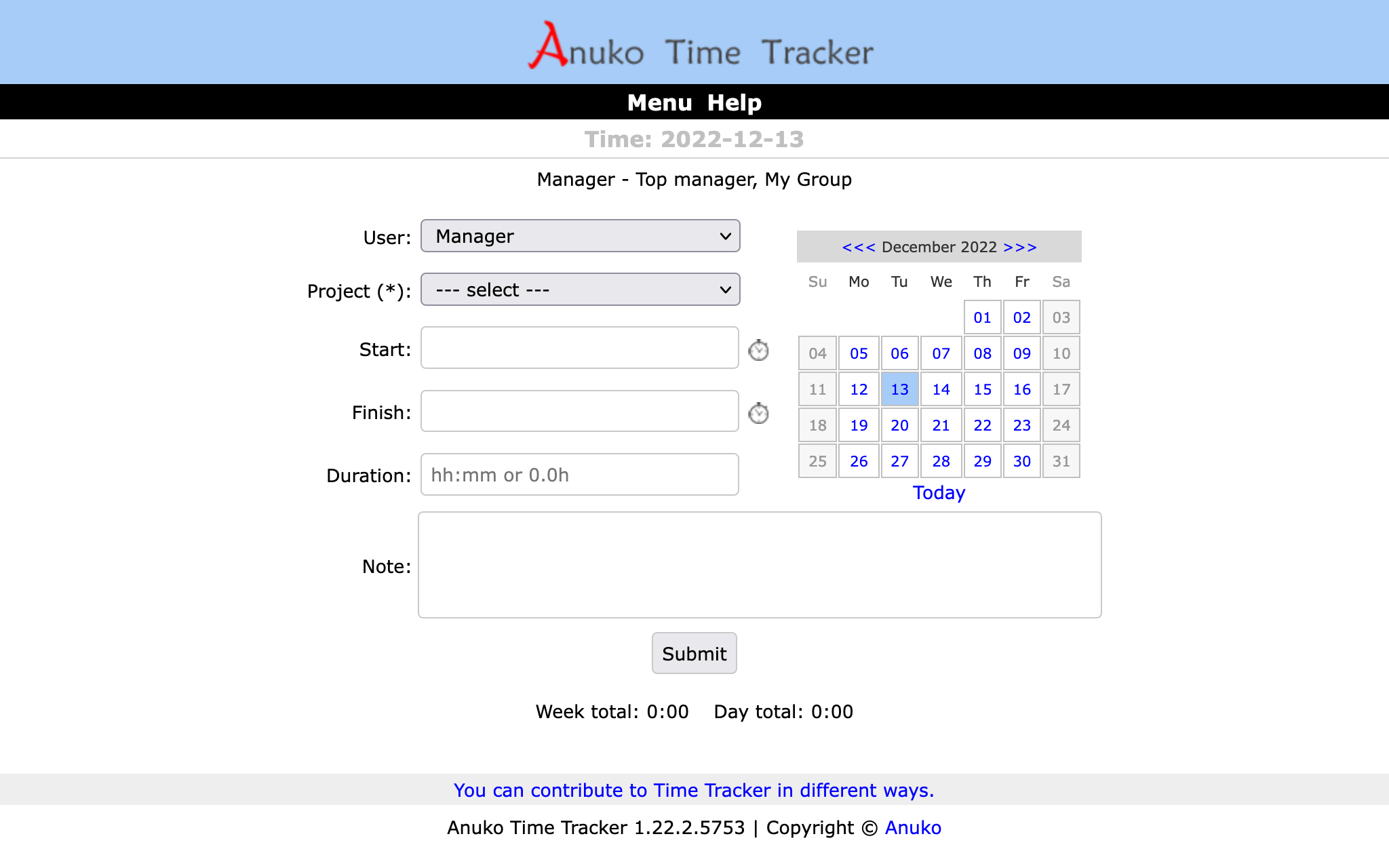 - User Roles: Anuko Time Tracker comes with a flexible, customizable set of user roles to which users are assigned. There are several pre-defined roles such as Top manager, Manager, Co-manager, Supervisor, Client and User that normally suffice for most installations. Custom roles can also be created.