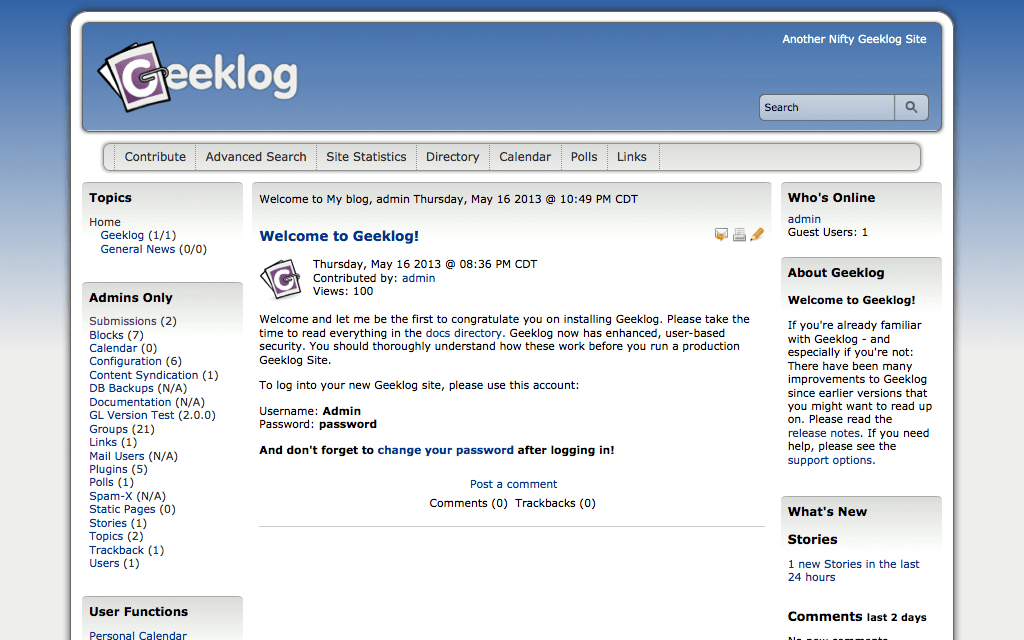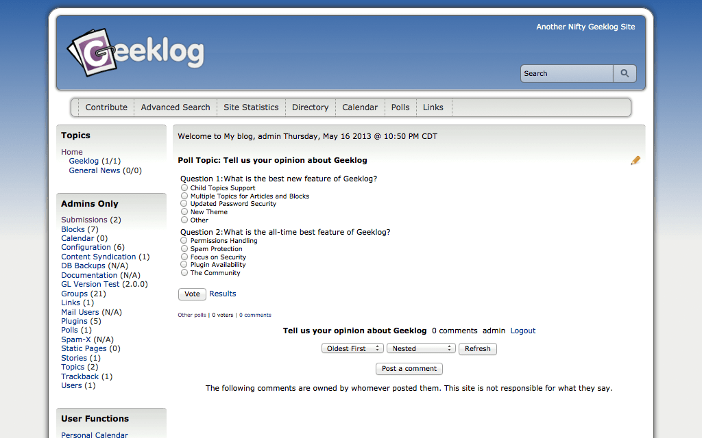 - Thin database abstraction layer allowing Geeklog to be ported to DBMS's other than the defaults (MySQL and MSSQL supported directly).