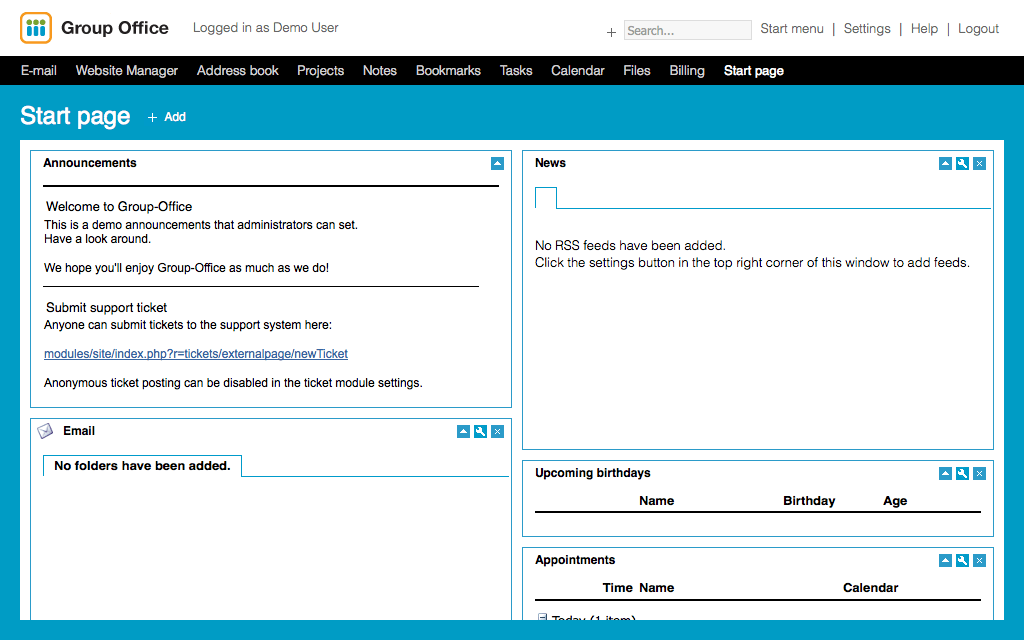 - Calendar: In a corporate environment a calendar can't be missed. This calendar allows you to plan all sorts of recurring events and set reminders for them. The easy to use interface will never let you miss an event. It's easy to set up multiple calendars and share them with other users. The calendar supports the import and export of the popular iCalendar standard. This makes it possible to synchronise the Group-Office calendar with other calendar software that support the iCalendar protocol.