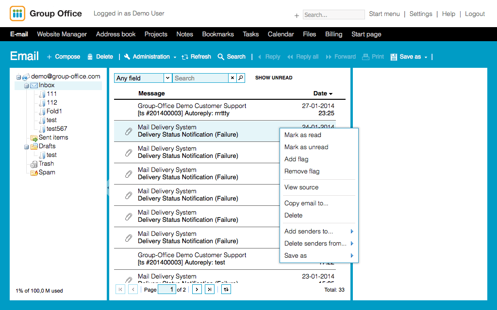 - E-mail: The flexible e-mail module integrates in all other modules. Link the mails easily to your customers and projects.