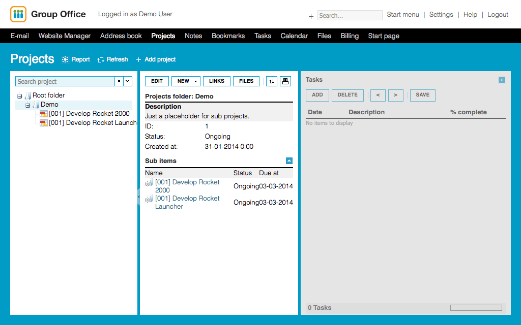 - Projects: With the projects module you can easily register working hours and keep all related information of a project in one place. You can link files, contacts, e-mails etc. to a project.