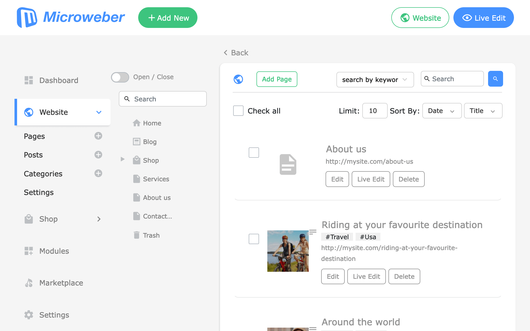 - Adding Content: Add Pages, Posts, Categories, and Products in your Microweber website without the need for coding.