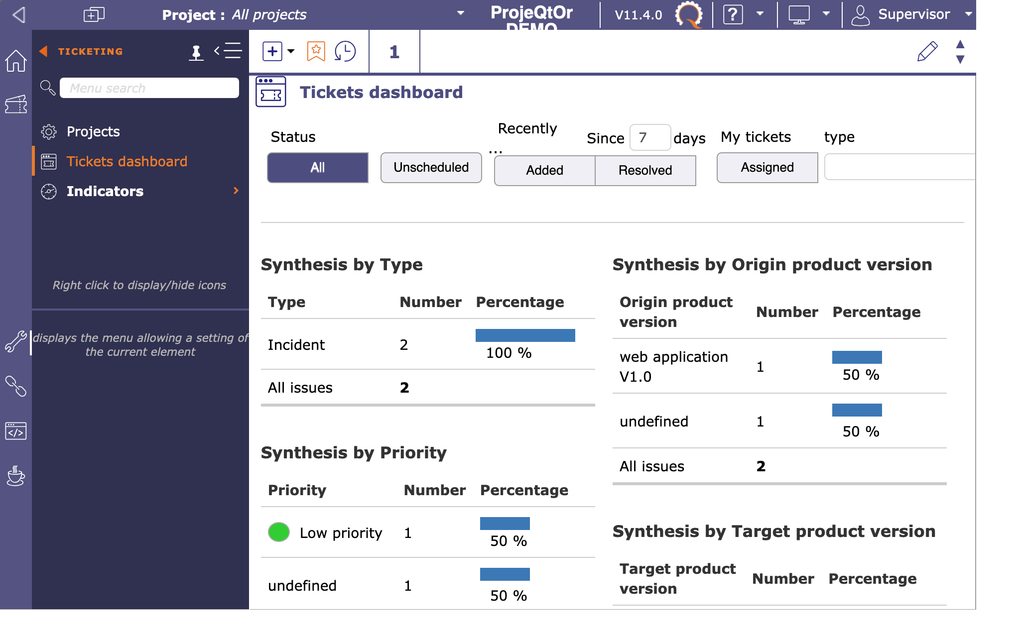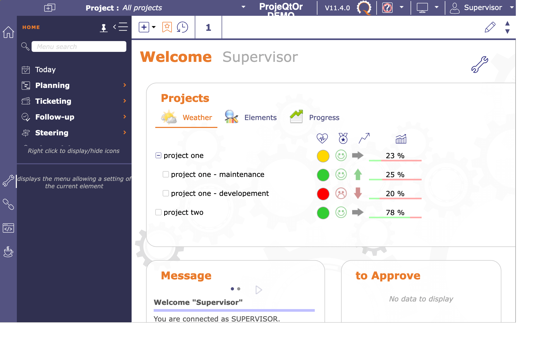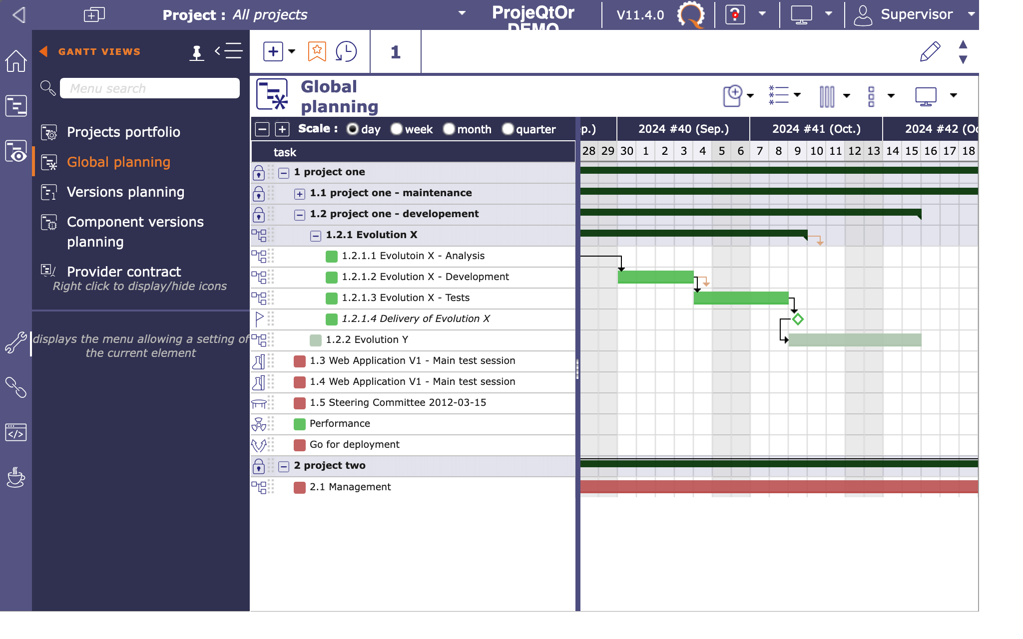 - Operational monitoring and strategic vision: Natively multi-projects, multi-level, ProjeQtOr records operational information to provide you with an overall strategic vision of programs and projects portfolio.
