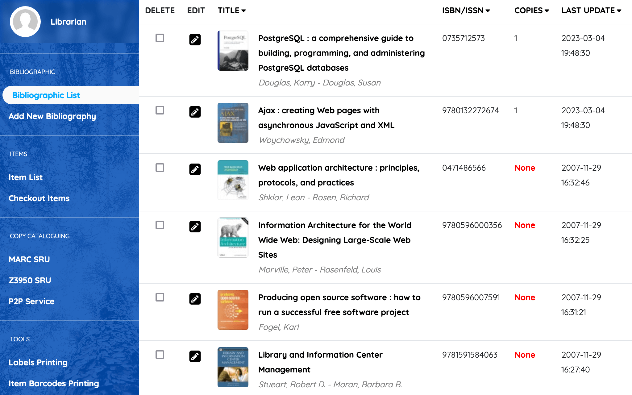 - Bibliographic/catalog database management with book cover image support