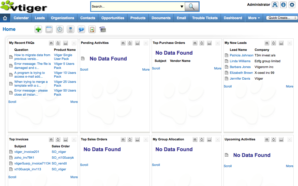 - vtiger CRM extends beyond traditional CRM boundaries by offering complete sales cycle management, seamlessly integrating pre-sales and post-sales activities by linking inventory management functions (from products and price books to vendors, sales quotes, purchase orders, sales orders, and invoices) with CRM modules (leads, accounts & contacts, and opportunities).