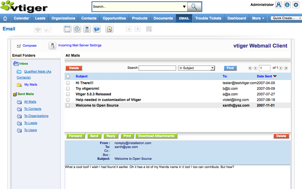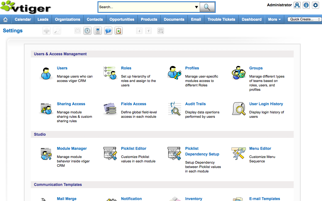 - With vtiger CRM's marketing tools you can stay a step ahead of your marketing campaigns with improved integration and oversight. vtiger CRM has tools for campaign management, mass e-mail marketing, online lead generation and sign-up forms, and product management tools for specialized or organization-wide marketing needs. Other marketing-related modules include calendaring, contact management, and more.